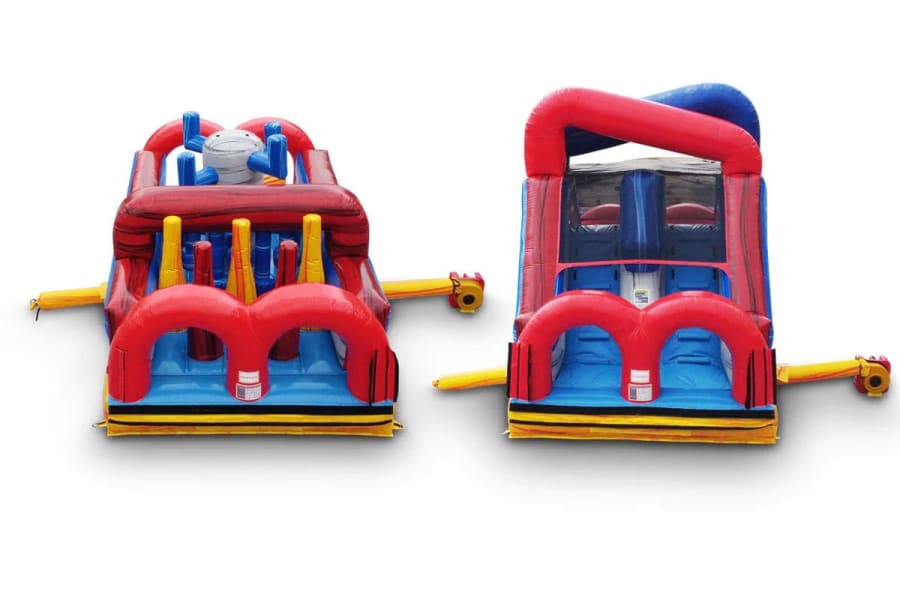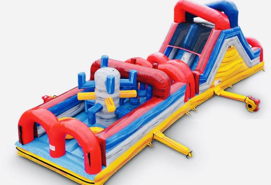 Race through this unique 40' Obstacle Course inflatable race course. This 2 person obstacle course is a fun and exiting race course for kids to adults of all ages. Manufactured with commercial grade PVC vinyl for the commercial party rental or indoor play center industry, or even for private backyard use, it is made with great quality and workmanship.