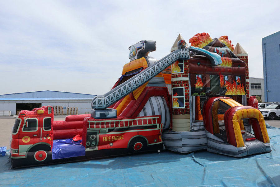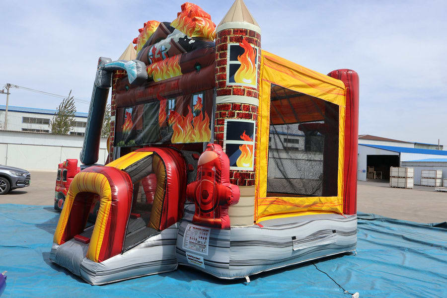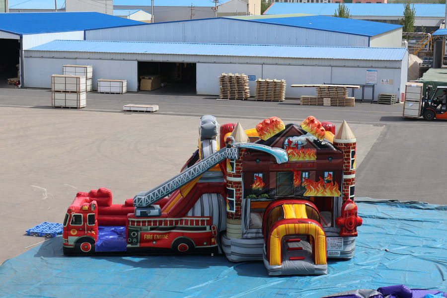 Get on board our Fire Truck & Fire Station Bounce House Slide 5 in 1 Combo. Let Your Kids Play Firemen For The Day! A Fire Bounce House For Your Little Fireman or Firewoman! This colorful life like 3D Fire Truck and Fire Station themed dualslide & bounce house combo is exciting to all little firemen! Includes a large bounce house, basketball hoop, climbing wall, & 10 foot tall double slide with custom fire station graphics. Book your date with this new rental today!