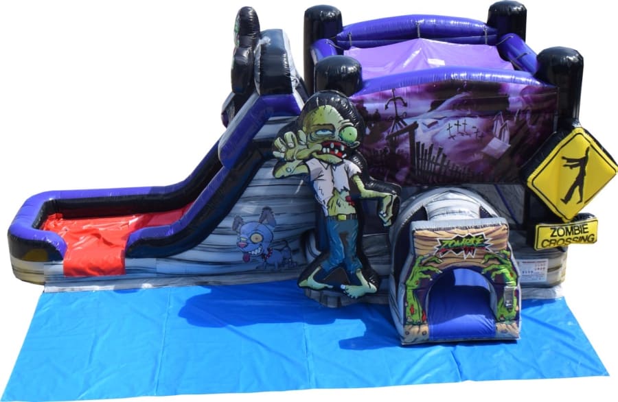 Your party or event won't signal the end of the world with cdubs Zombie Bounce House Slide Combo. This Zombie Bounce House and Slide features eye-catching graphics of zombies that have come back from the dead. Partygoers can jump away from the living dead inside the bounce house and shoot baskets on the attached inflatable hoop. Then they can escape up the climbing wall and down the attached slide to make it back to base camp.