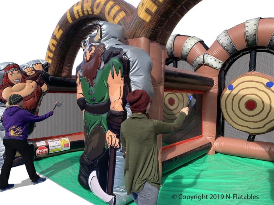 Axe throwing has become hugely popular, and now it's the hottest new inflatable interactive game. Larger-than-life artwork, realistic foam axes, and a durable built-in vinyl floor make this the best inflatable axe throw, period. Our axes are made of a durable foam, making them both safe and realistic. The axes look and throw like real axes, and securely stick to the hook-and-loop target. Other inflatable axe throws barely look like axes! The Axe Throwing inflatable is an absolute favorite for field days at School, Fundraising, carnivals, block parties or a company events!Games And ExtrasAXE THROWING 3D