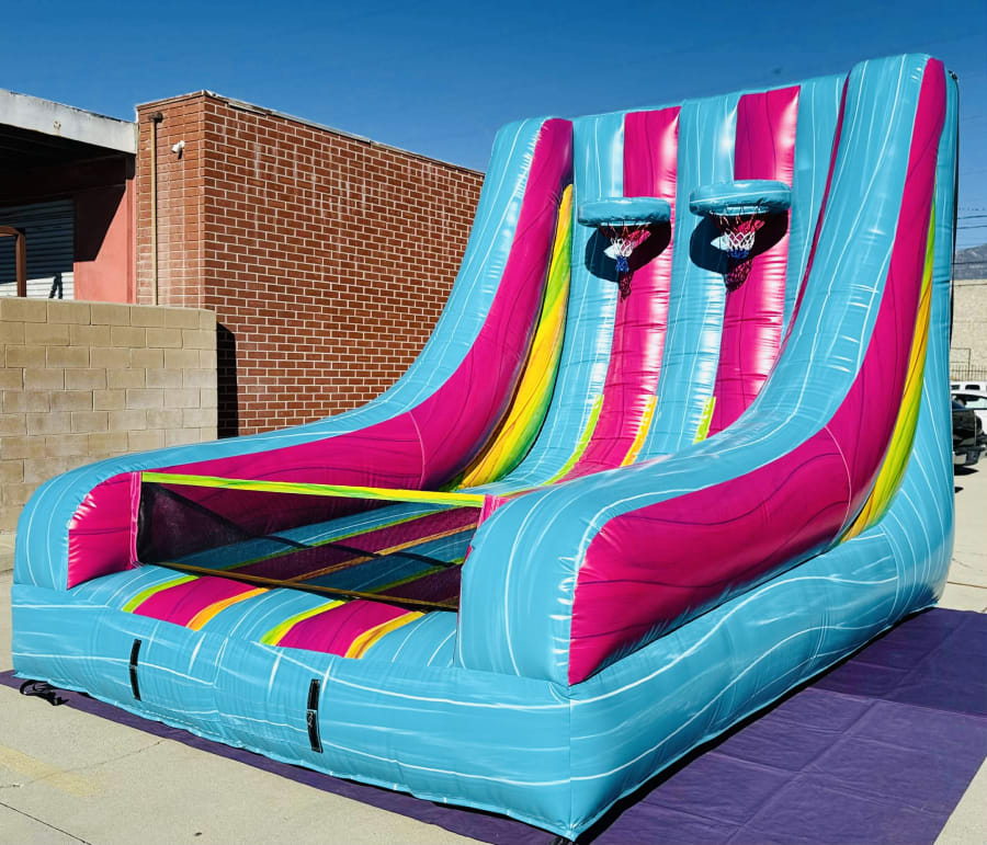 Bring high energy fun to any party or event with this colorful inflatable basketball challenge. Featuring two side by side hoops, this game lets players compete head to head to see who can score the most baskets. The tall, curved backboard design helps keep the ball contained, while the bright teal, pink and yellow marble pattern adds an eye catching look that stands out at any venue.