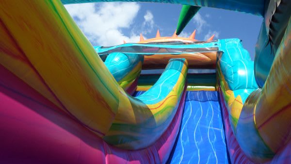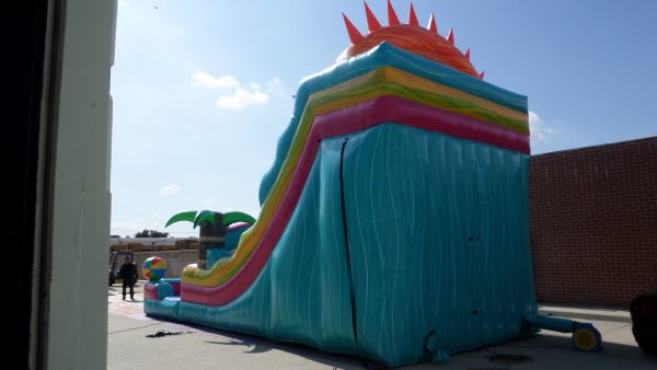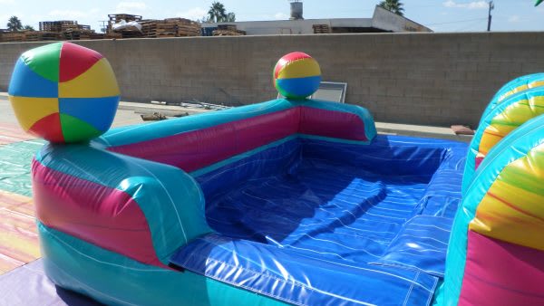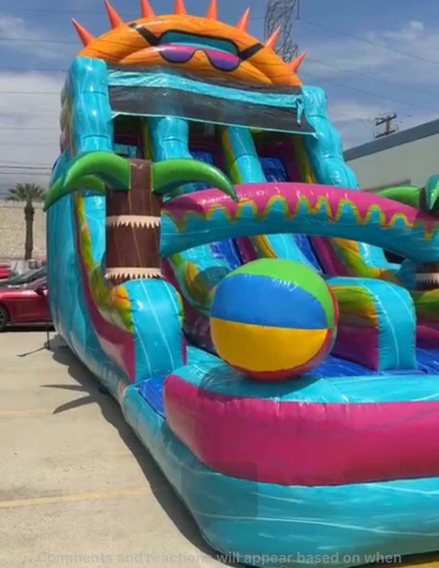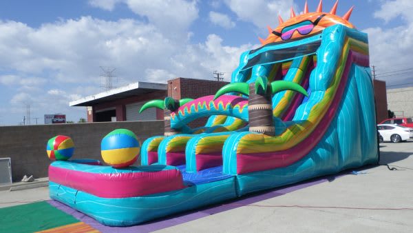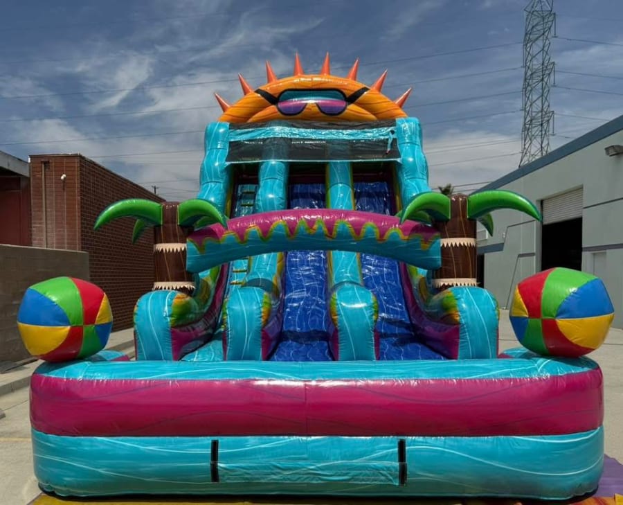 This colorful inflatable dry slide burst with summer vibes, featuring a giant smiling sun wearing cool shades at the top and 2 oversized beach balls on each side. The slide’s bright, wavy stripes in teal, pink, yellow and orange create a tropical festive feel. A central climbing lane leads to the tall slide, making it perfect for indoor and outdoor parties, poolside fun and warm weather events.
