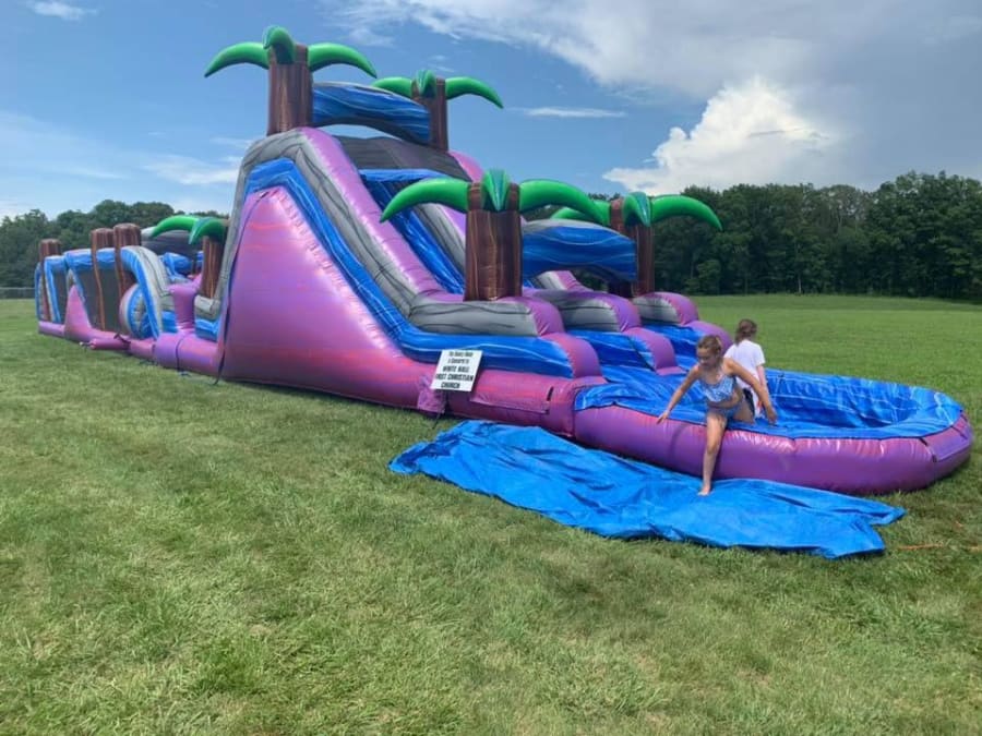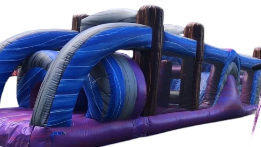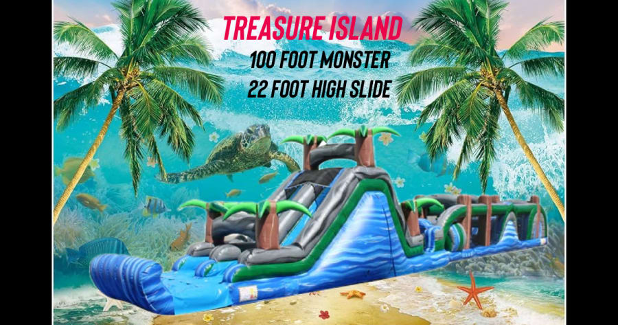 Central Illinois is home to this impressive hundred-foot treasure island, featuring an extensive obstacle course that can accommodate individuals weighing up to 200 pounds. The course is designed to facilitate two participants at a time, guiding them through a massive gateway and various obstacles and slides. A notable feature is the internal slide, which connects to a 22-foot double slide and a swimming pool. The blue-green design ensures a gender-neutral experience. Let's arrange a competition, incorporating the water connection that sprays participants as they navigate the slide. The obstacle course boasts an extraordinary design.